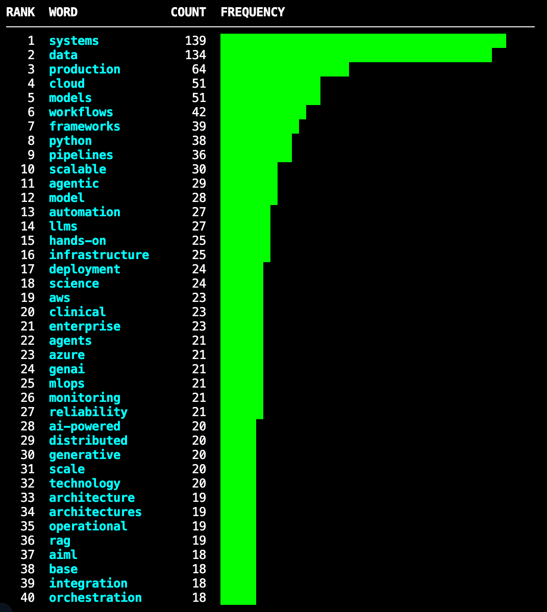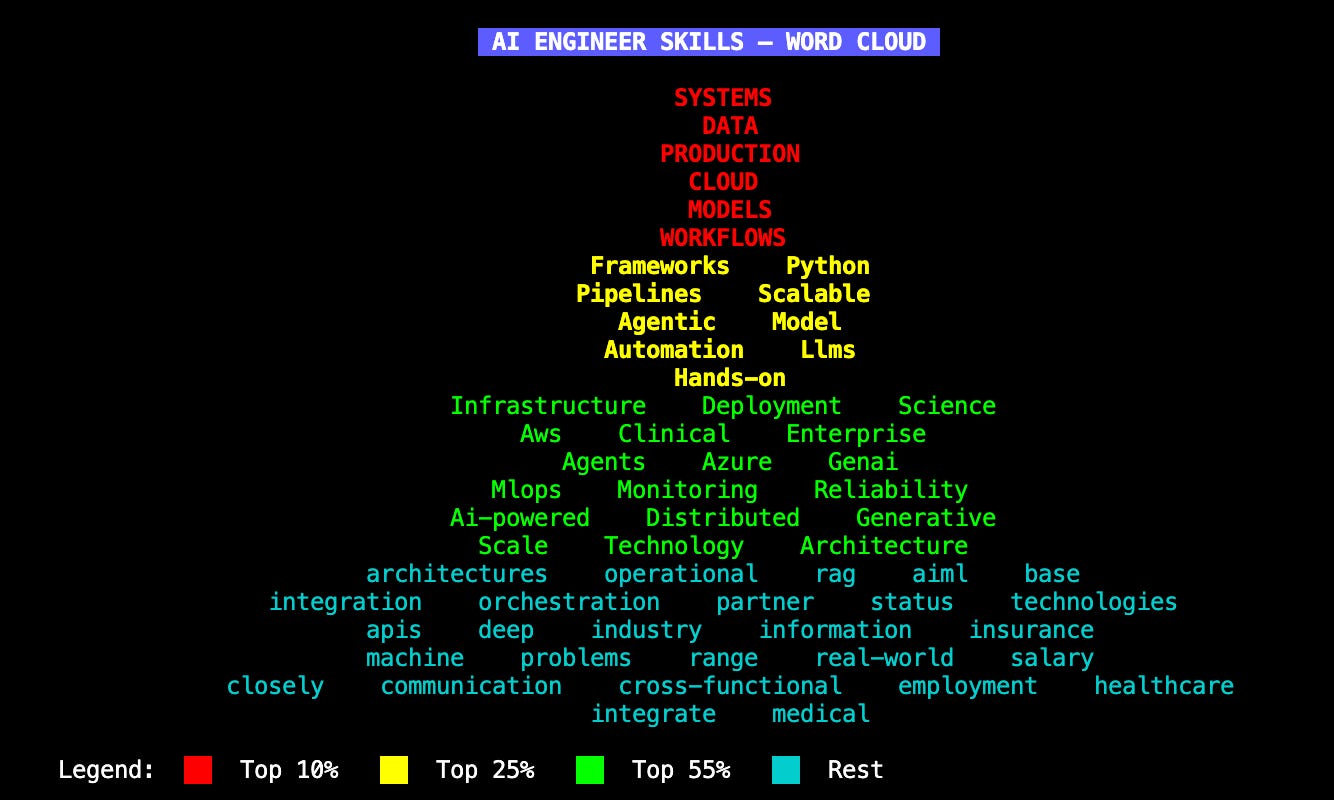 I want this to be practical from my experience over the last few years building AI systems, as well as what the actual data says, pun intended. Good intentions are just that, but seeing this word analysis of 30 job descriptions for AI Engineers helps solidify that we are going down the right path.