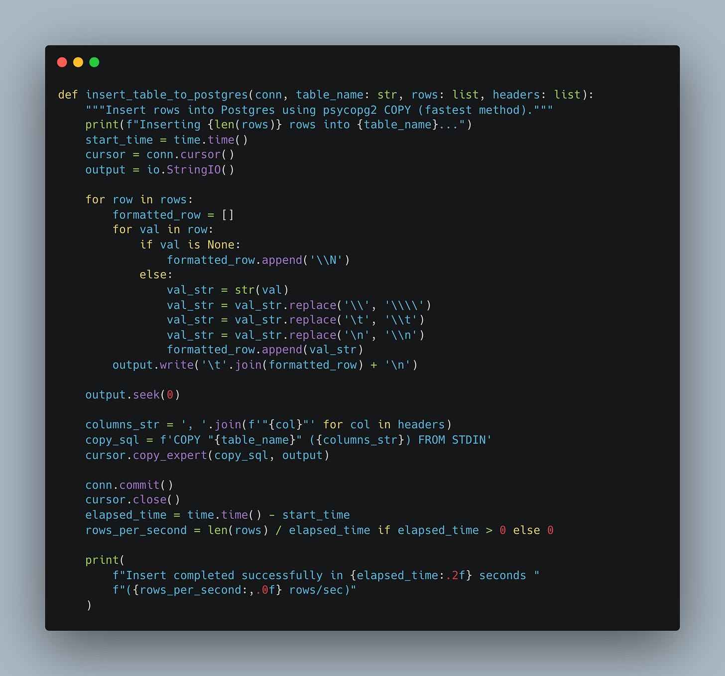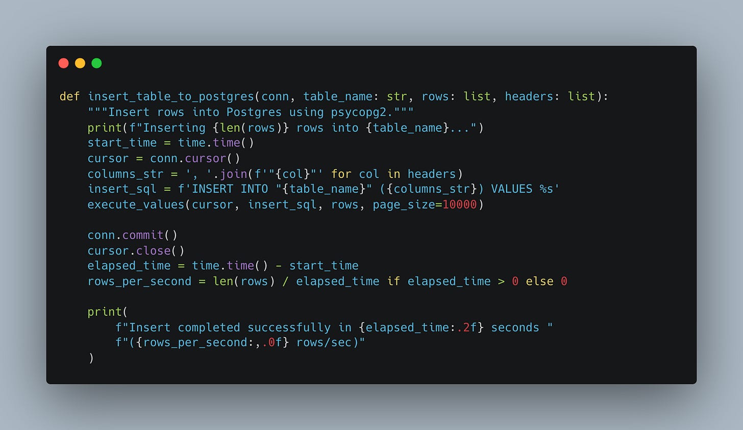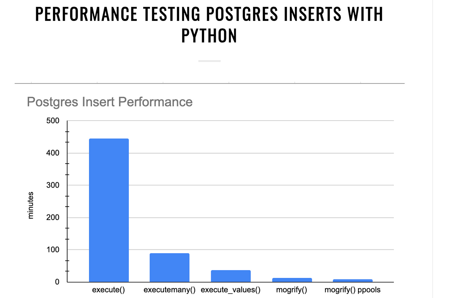 Insert completed successfully in 60.23 seconds (79,003 rows/sec)If you are interested in reading more about psycopg2 inserts, and performance, check out the below post.