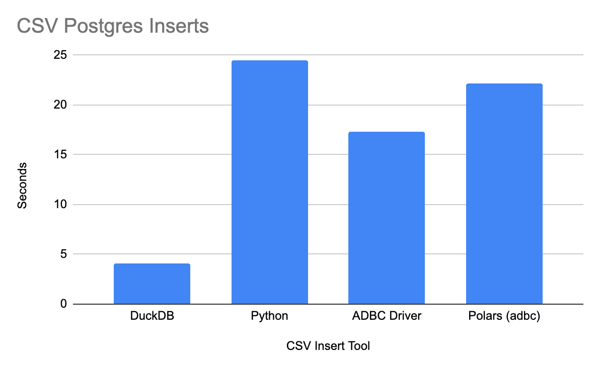 In my play benchmark, ADBC drivers with Python beat out vanilla Python easily enough, but didn’t come close to touching DuckDB. Competition and options are good things in life, it will only push the data community farther, together, for the good of all.