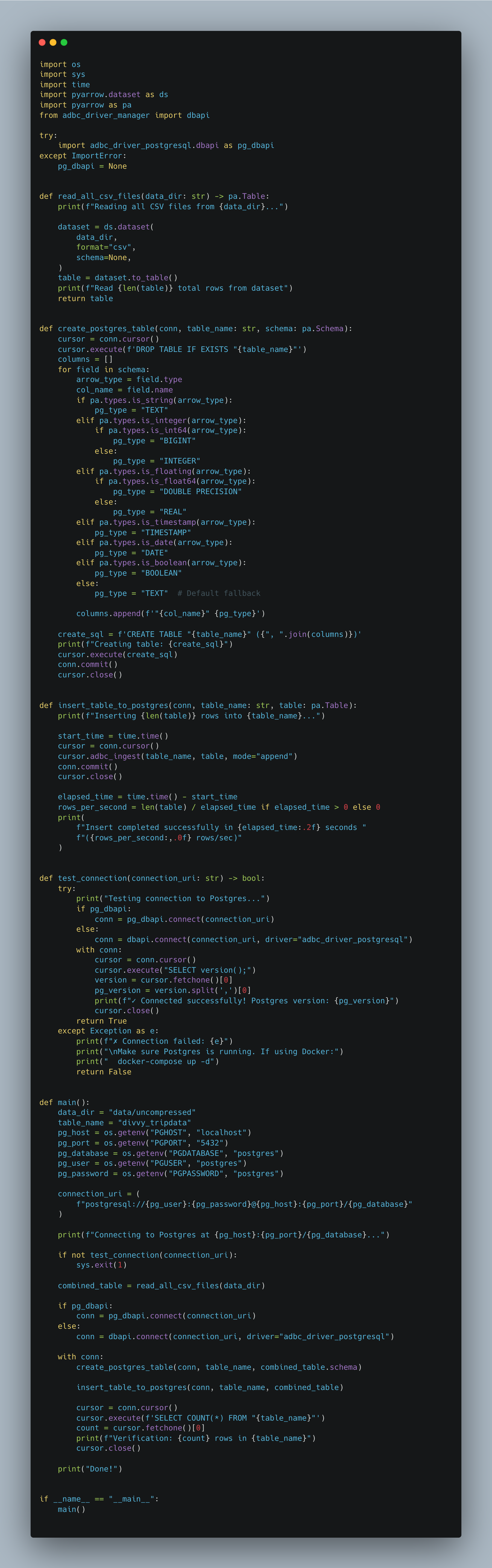 Let’s dive into using Apache Arrow ADBC drivers to shove data into Postgres. We will use a local Docker instance for the database. Also, we will use PyArrow to read and prepare the data for insertion, and we will add timers only for the INSERT part.