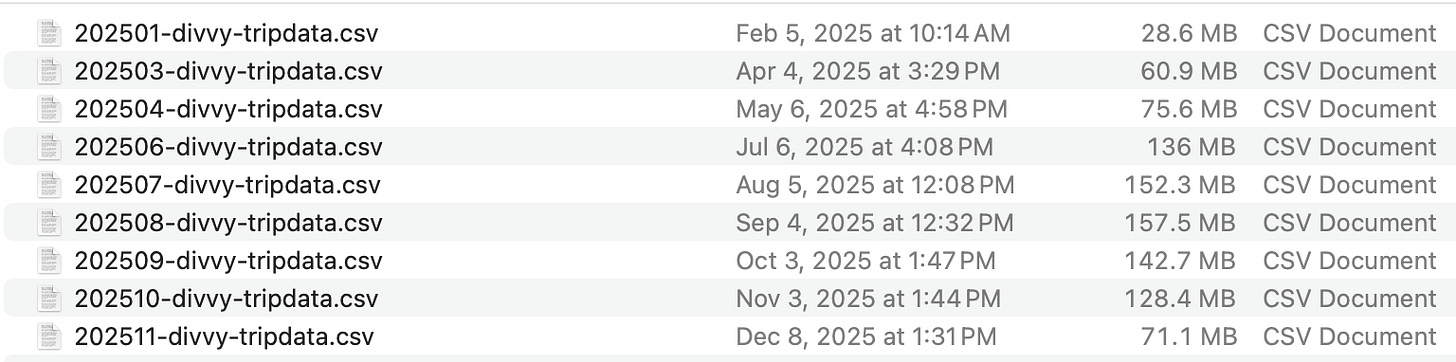 Let’s gather some 2025 data from the Divvy Bike Trips open source dataset.