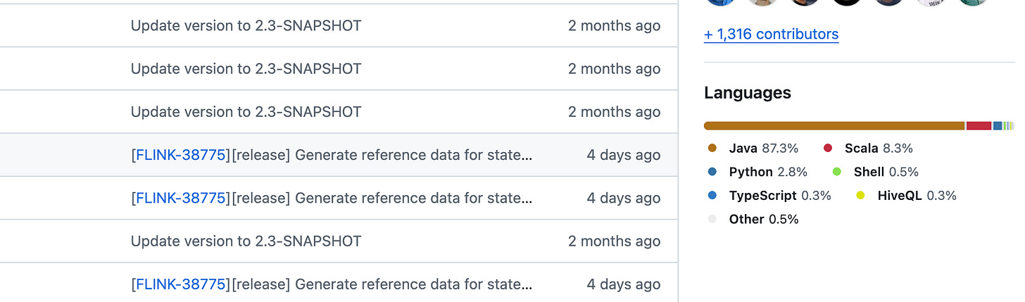 Ok, we have to start somewhere, and I’m not going to assume you have experience working with “streaming.” If we head over to the GitHub page for Flink, we can see that it’s mostly written in Java. That language no one talks about, but everyone uses.