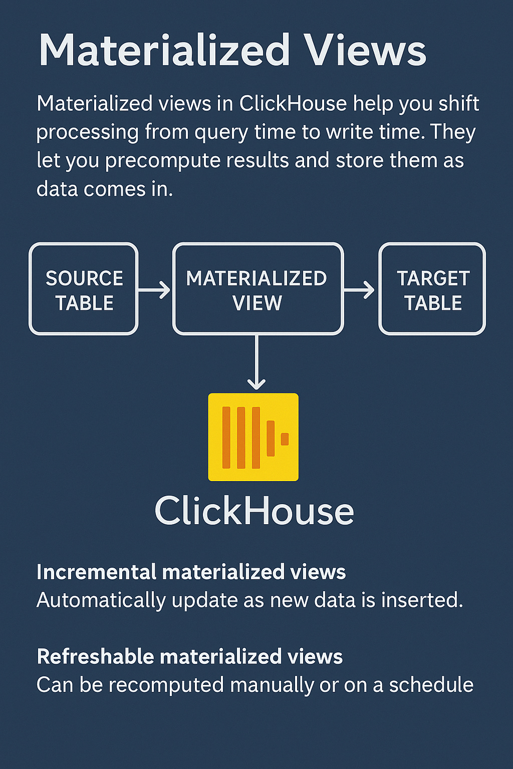 Materialized views in ClickHouse help you shift processing from query time to write time. They let you precompute results and store them as data comes in. There are two types:Incremental materialized views: Automatically update as new data is inserted.