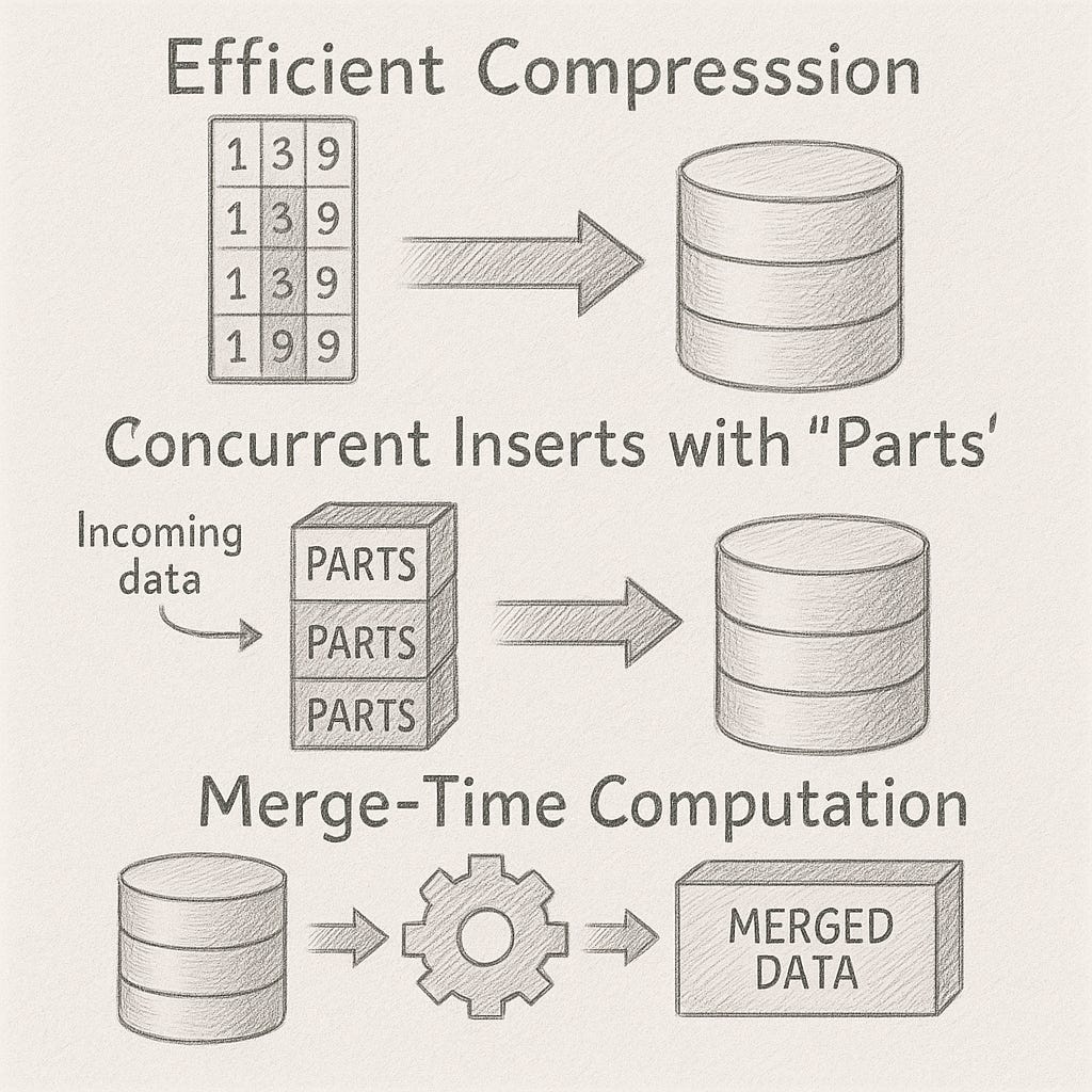 ClickHouse lets you choose different storage engines depending on your use case, even within the same schema. The two main families are:MergeTree-based engines: These support background merges and are super flexible. Most production tables use one of these. Examples include: