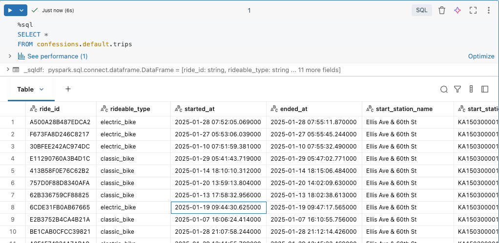 Let’s make our own Metric View with Divvy Bike trips. This dataset contains a bunch of bike rides people took in different cities, along with their start and end locations.