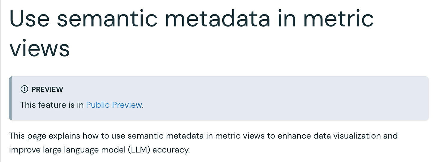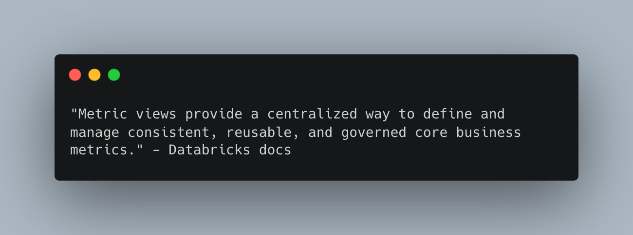 Databricks Metric Views are a unique take, and the perfect Semantic Layer to capture not only the very technical details of a METRIC, how something is calculated, but also how the business refers to that idea, with features like synonyms. Amazing.