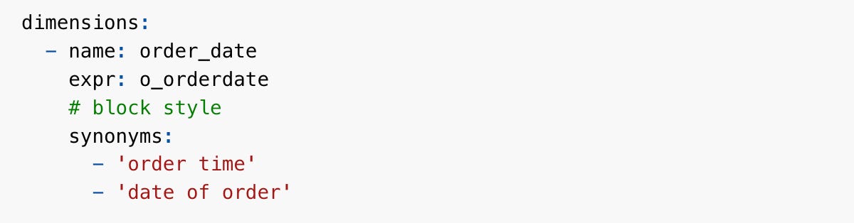 “Semantic metadata includes display names, format specifications, and synonyms that provide additional context.” - docs
