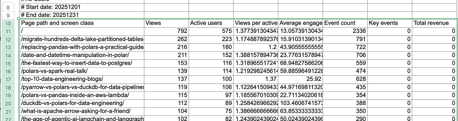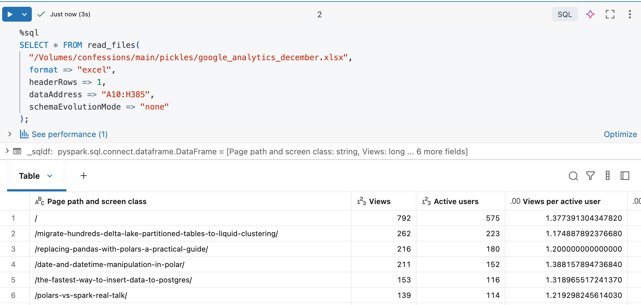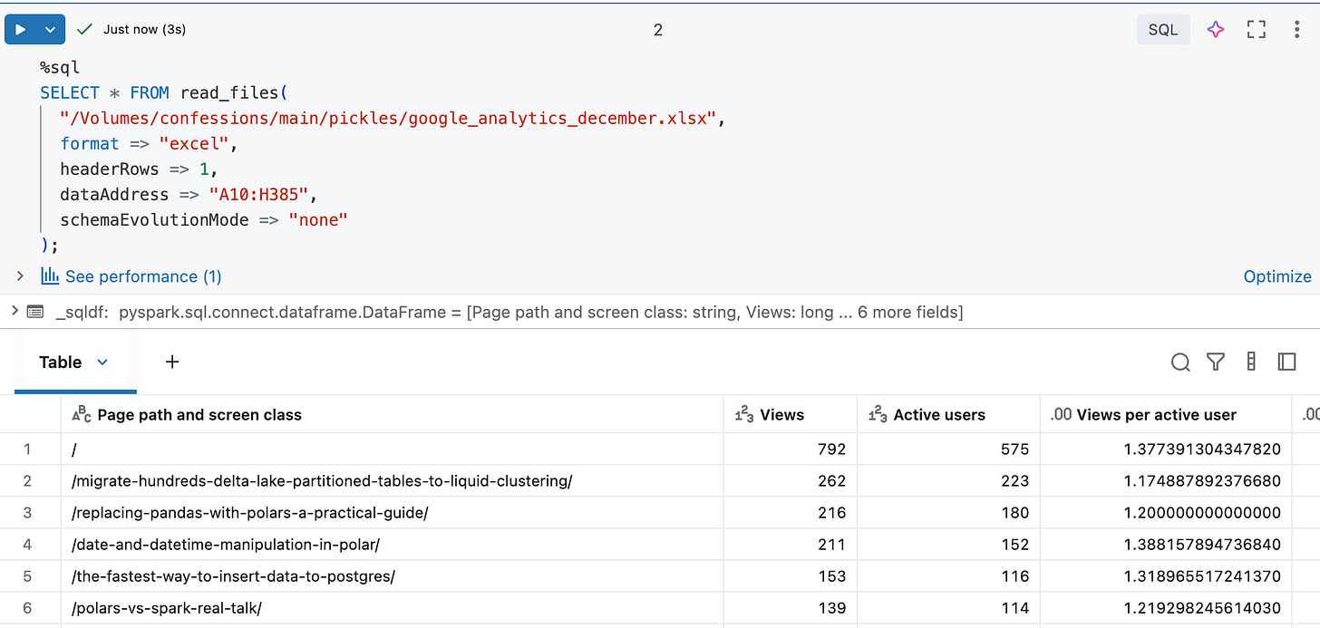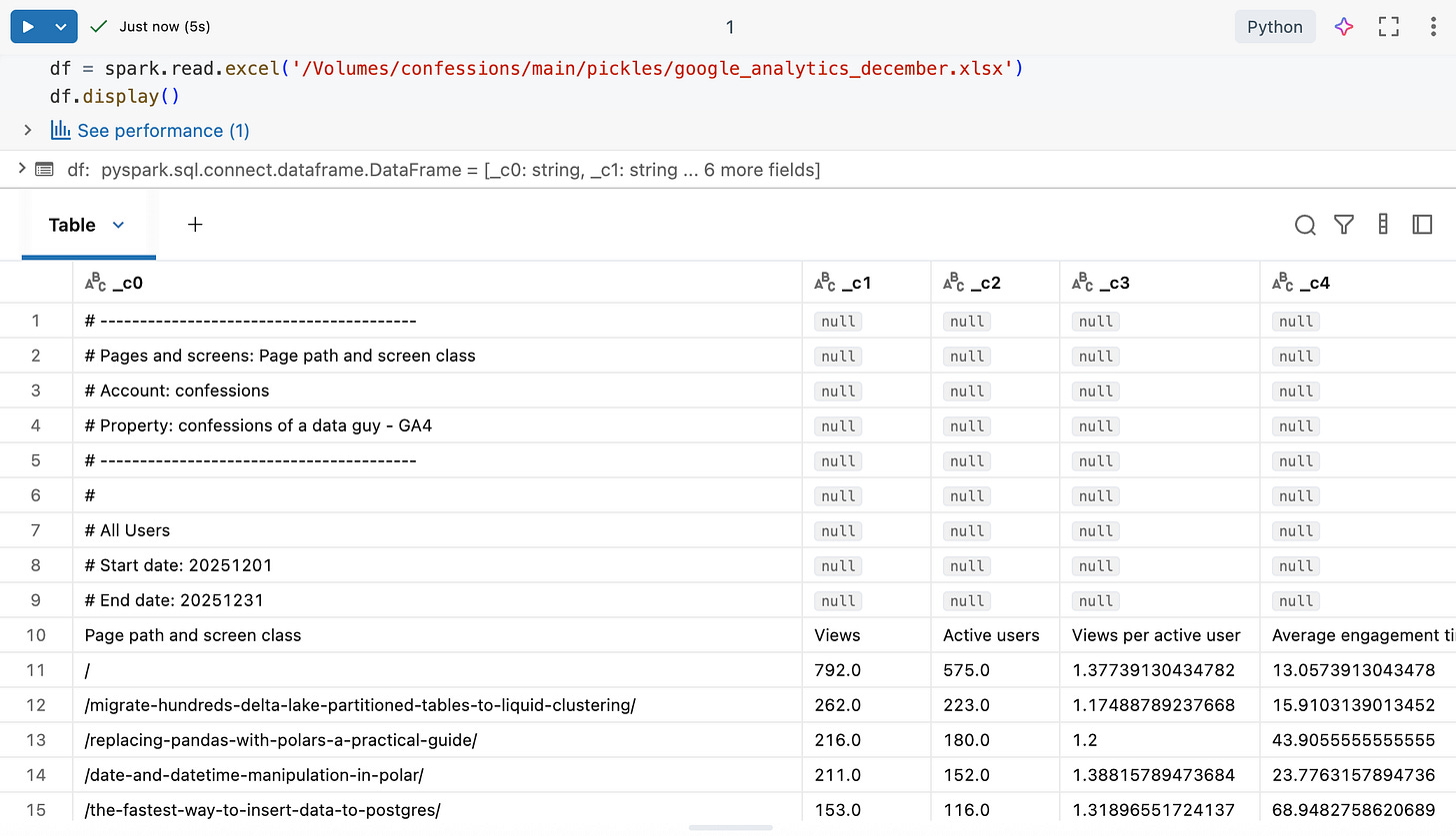 Databricks Runtime 17.1 or above.First, we should get a “normal” Excel file, something that comes from the real world and hasn't been massaged to work. I have run another blog, www.confessionsofadataguy.com, for many moons. We will download the December numbers from Google Analytics from that website. Raw, just as it comes in the Excel file download.
