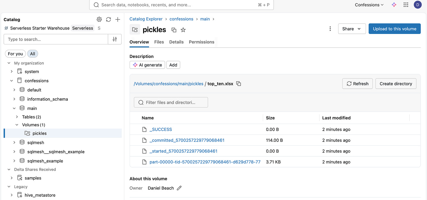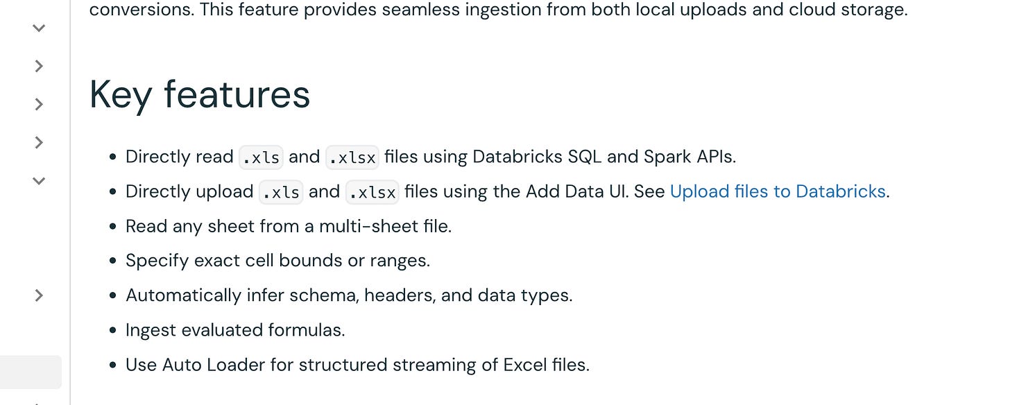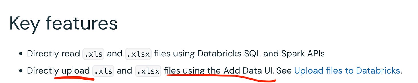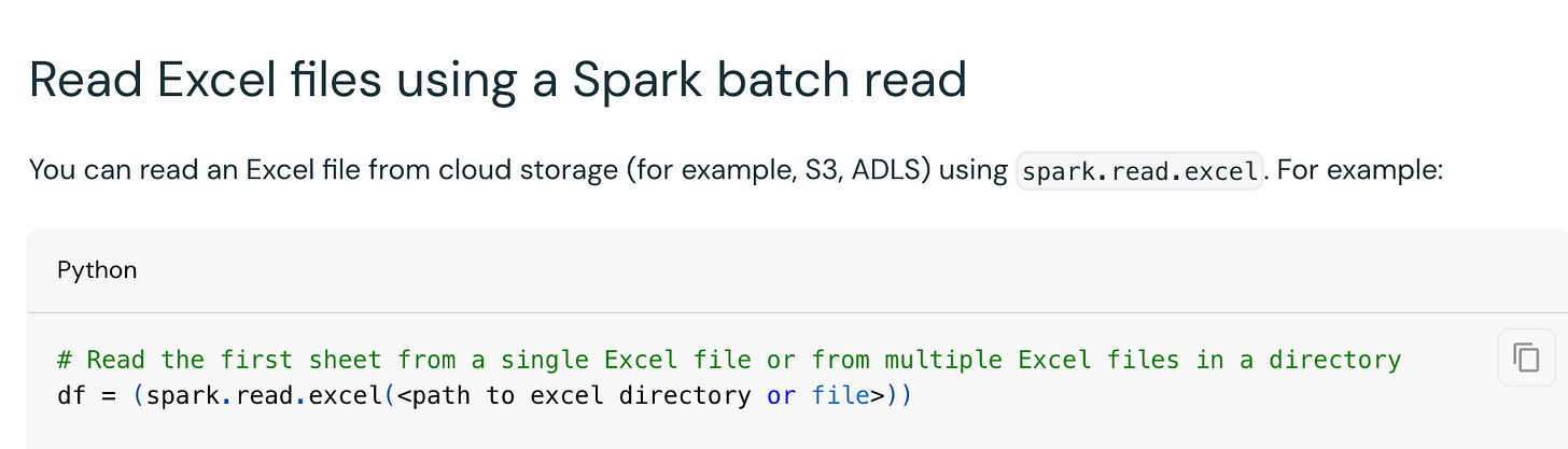 I am going to skip the other options Databricks has added for Excel, like AutoLoader, COPY INTO, blah, blah. Feel free to go dig through that crap if you want.