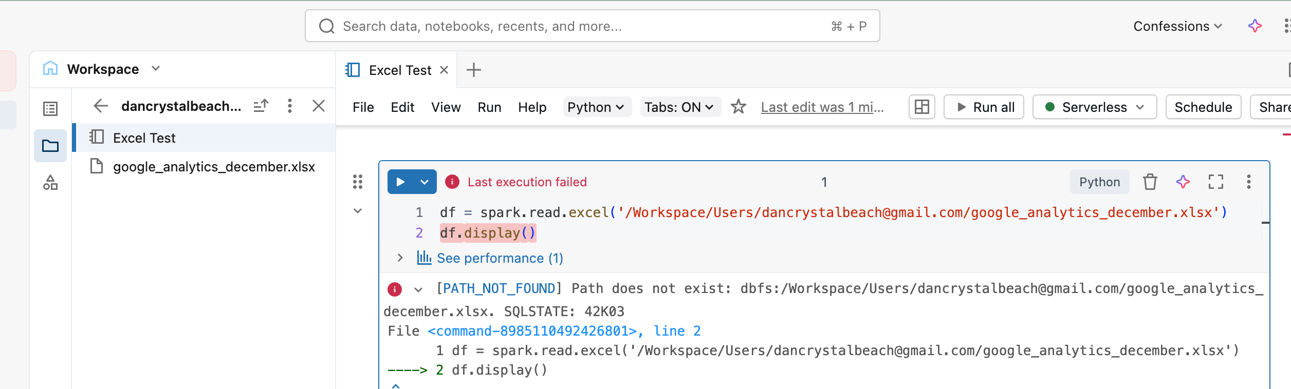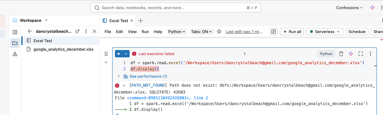 Let’s crack open a Databricks Serverless attached Notebook. I went ahead and uploaded the Excel file to my workspace, copied the full path by right-clicking the file, and tried to open it.