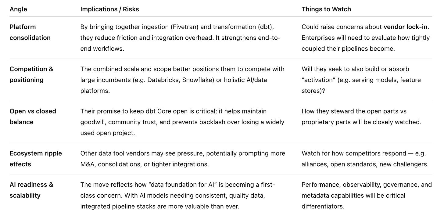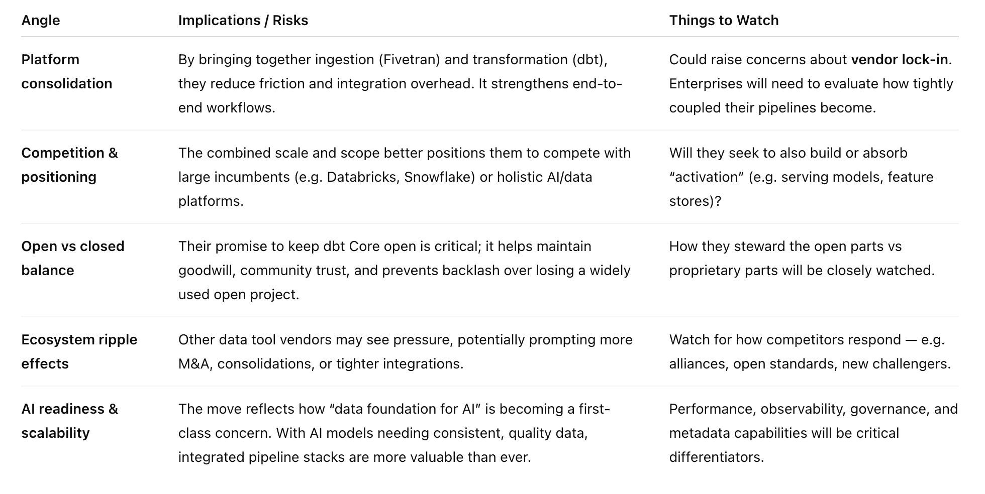 The combined company is positioning itself as an “open data infrastructure” platform — combining data movement (ingestion), transformation, metadata, and activation — while preserving flexibility around compute, catalog, BI, and AI layers. Business Wire