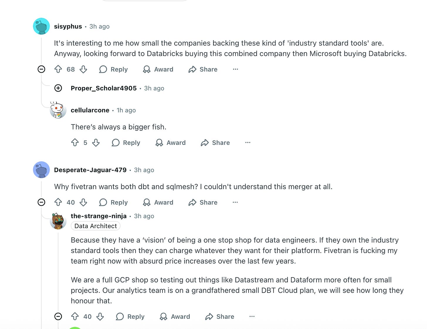 Maybe this Fivetran + dbt Labs thing will turn into the third horseman of the apocalypse. Competition is never bad in the SaaS field; it drives innovation and benefits end users.