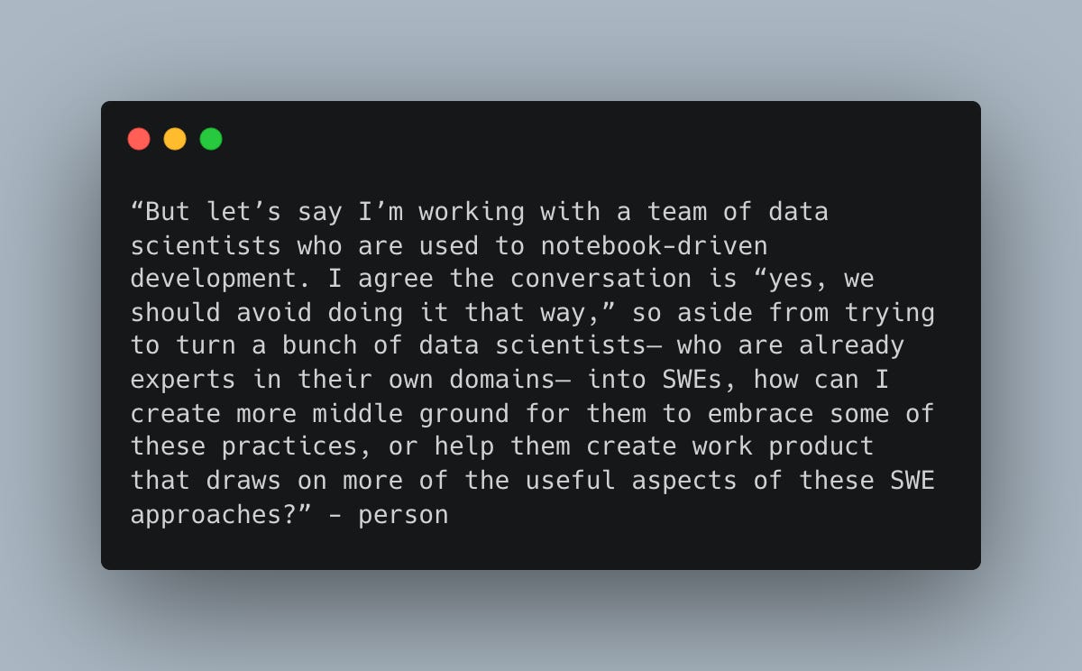 • The main problem is that the Notebook Engineering mindset follows you down the AI path and probably just amplifies the bad habits you have already adopted.