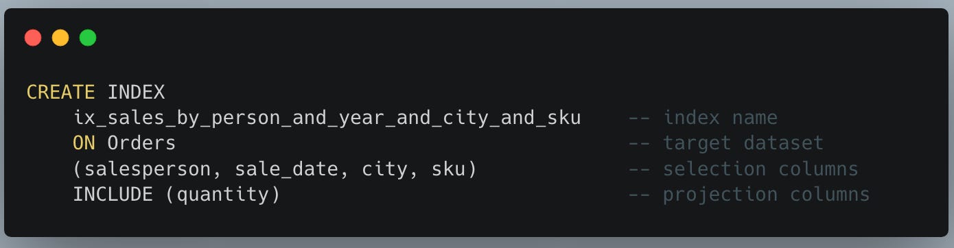 What we're effectively creating here is a logical table that contains everything we need to speed up our query. It's a bespoke index tailored to this particular query. Note how it corresponds to our original query's columns.