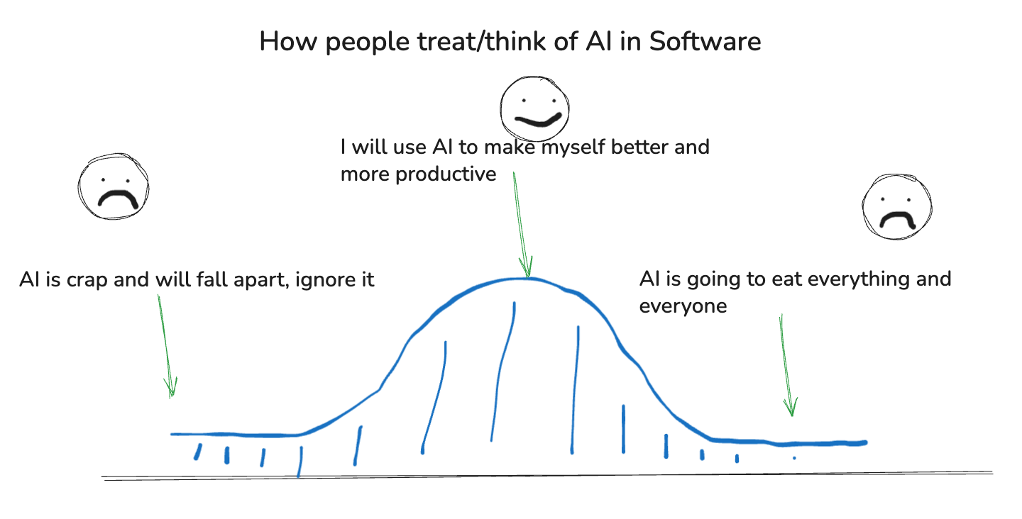 The discussion about the intersection of AI and any job, including software, is fraught with emotions, both real and not-so-real. Everyone has an opinion, probably strongly held, and that’s fine. I encourage you to take the middle ground, that’s probably where the truth lies … not at either end of the spectrum.