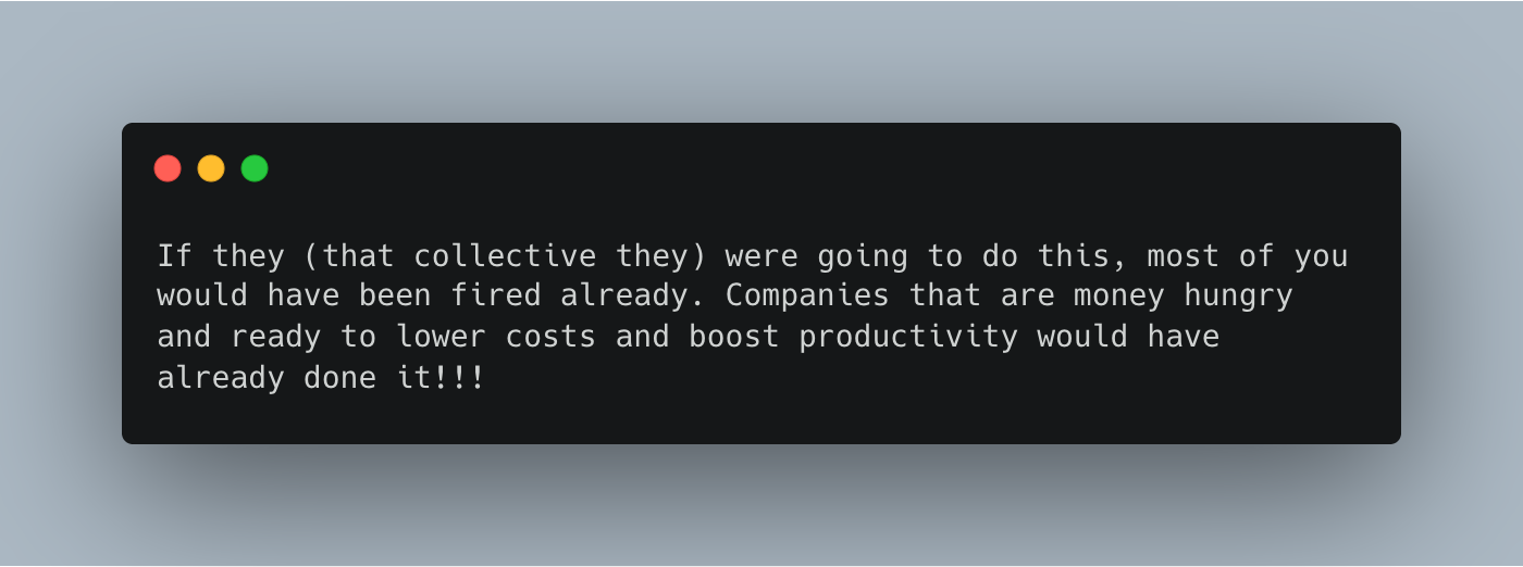 To anyone who’s been laid off or fired, because of AI or anything else, I feel for you, that sucks, and I hope you find the next thing soon, and it’s better than where you came from. Always look forward to the future; the past has lessons, but it’s best not to dwell too much.